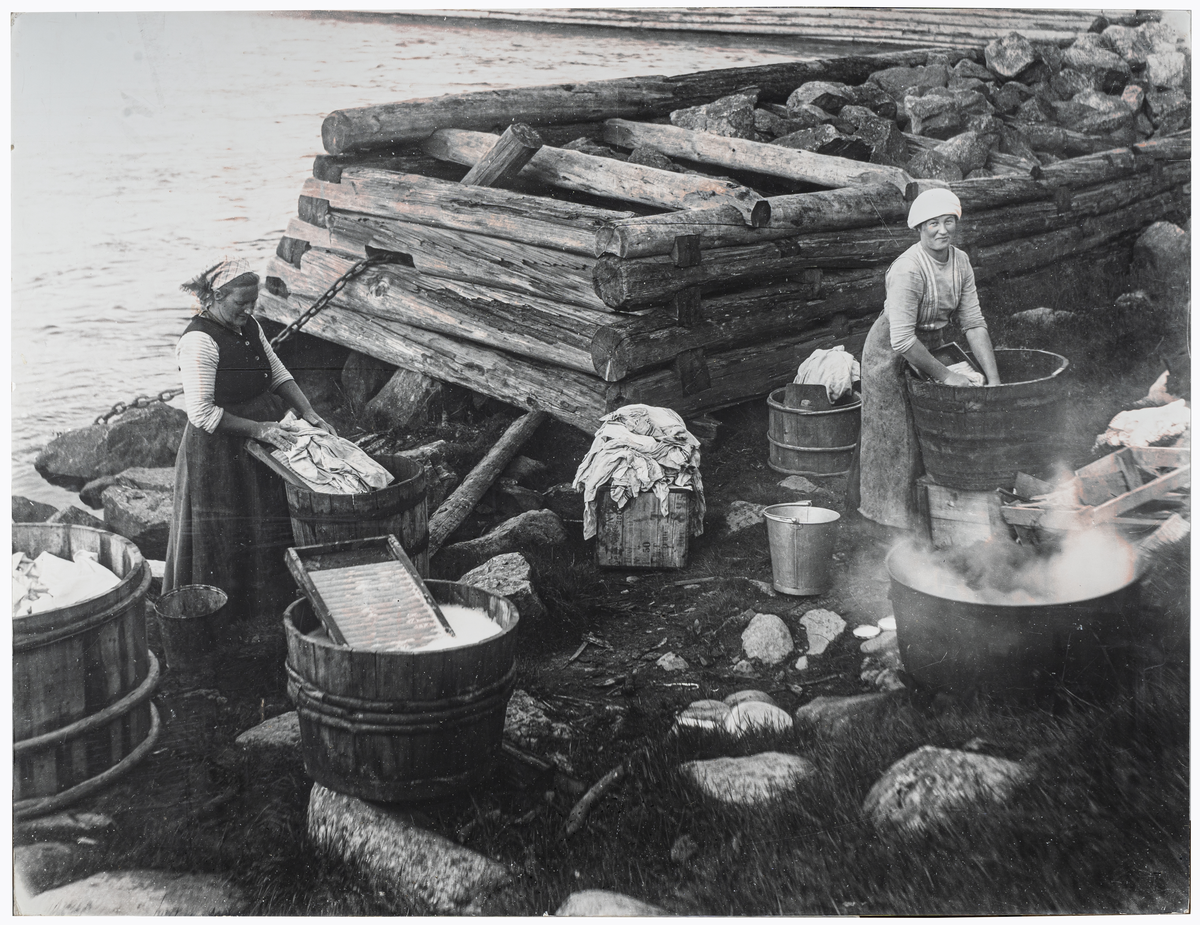 Till vänster "Jumblas"-Kristin Edlund från Voxsätter 13:5, född 1873, och till höger Målar-Elin (Nilsson), född 1893, som tvättar vid Voxnan. Bilden troligen tagen 1915.