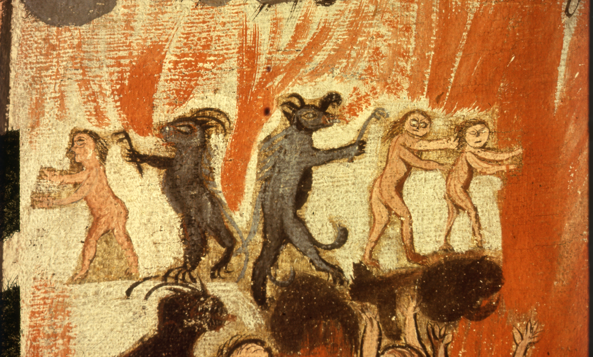 Del av väggdekor. Bibliskt motiv. Detaljbild på människor och bockar i skärselden.