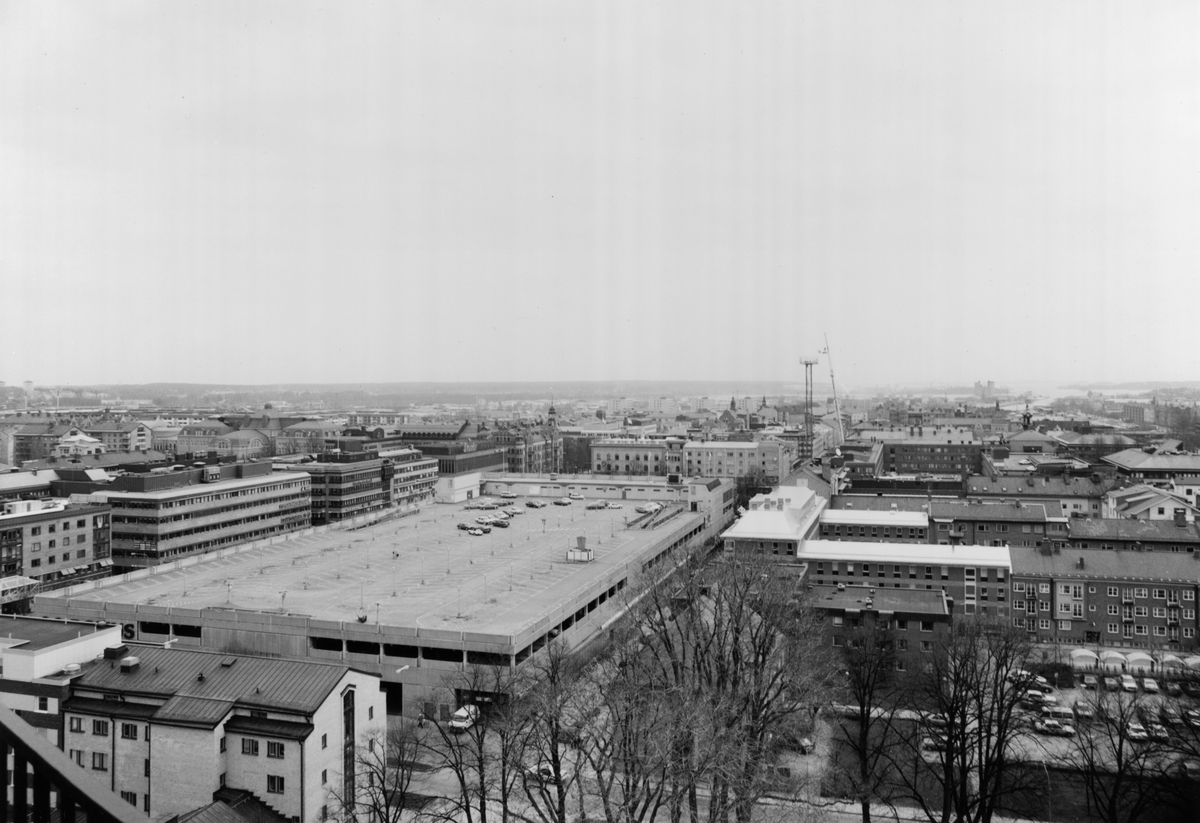 Del av centrala Gävle från Trefaldighetskyrkans torn mot öster. Domusbyggnaden i mitten.