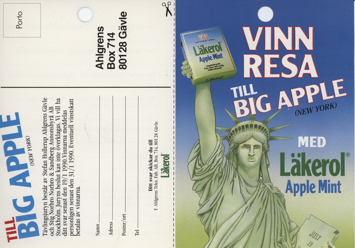 Dubbelt ävlings blad med texten " Vinn resa till the big apple!" Samt en bild på frihets gudinnan som håller en Läerol Appelmint tablettask på framsidan.