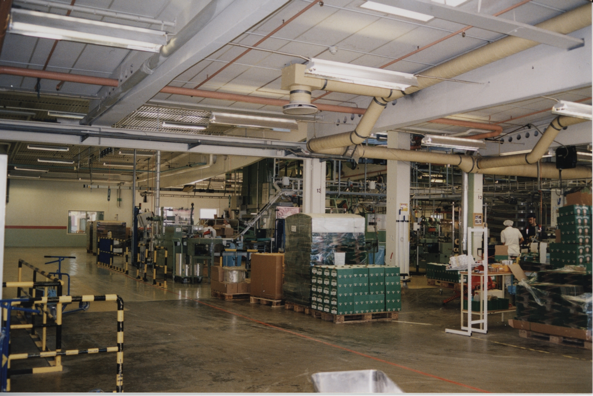 Flip Top maskinen i bakgrunden. Läkeroltråg handpackas i lådor och ställs på pall i förgrunden.