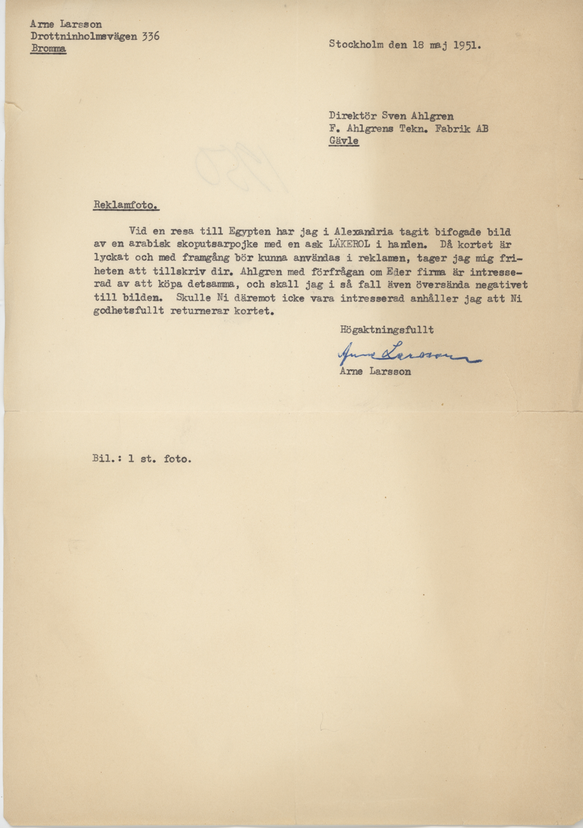 Reklamfoto: Vid en resa till Egypten har jag i Alexandria tagit bifogade bild av en arabisk skoputsarpojke med en ask LÄKEROL i handen. Då kortet är lyckat och med framgång bör kunna användas i reklamen, tager jag mig friheten att tillskriv. dir. Ahlgren med förfrågan om Eder firma är intresserad av att köpa detsamma, och skall jag i så fall även översända negativet till bilden. Skulle ni däremot icke vara intresseradf anhåller jag att ni godhetsfullt returnerar kortet.