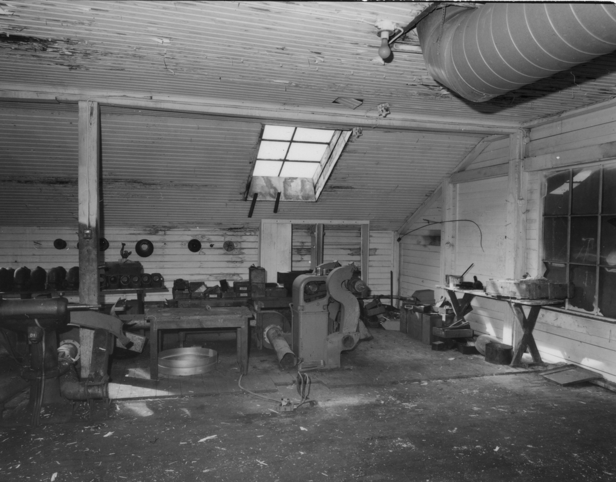 Vindsvåningen med slipmaskiner och halvfabrikat märkta "ATSA".
