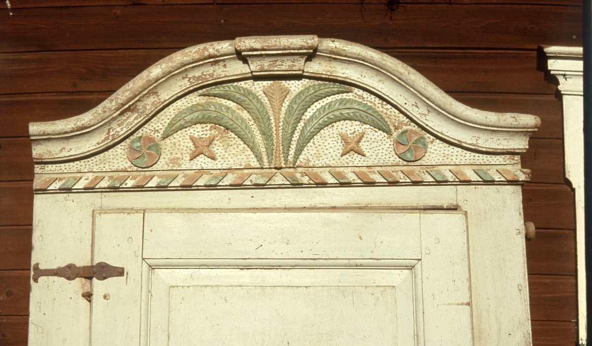 Del av skåp, sniderier och måleri. Ett beslag syns i bild.