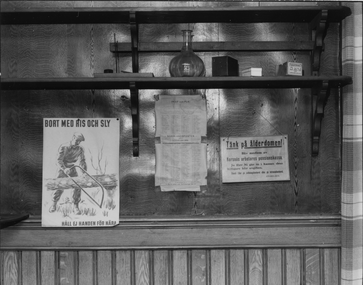 Vägg mot söder, första rummet med hyllor, karaff, lådor med "glas"