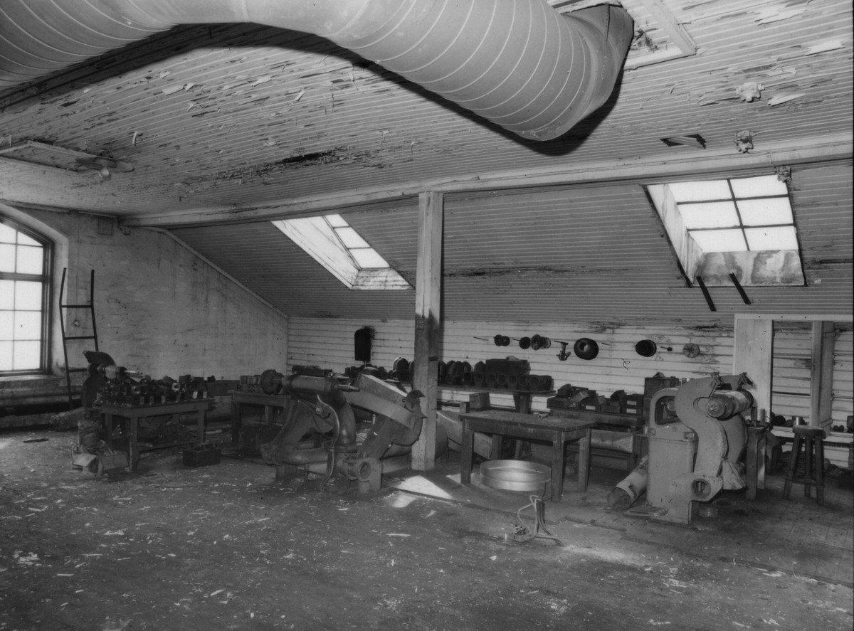 Vindsvåningen med slipmaskiner och halvfabrikat märkta "ATSA".