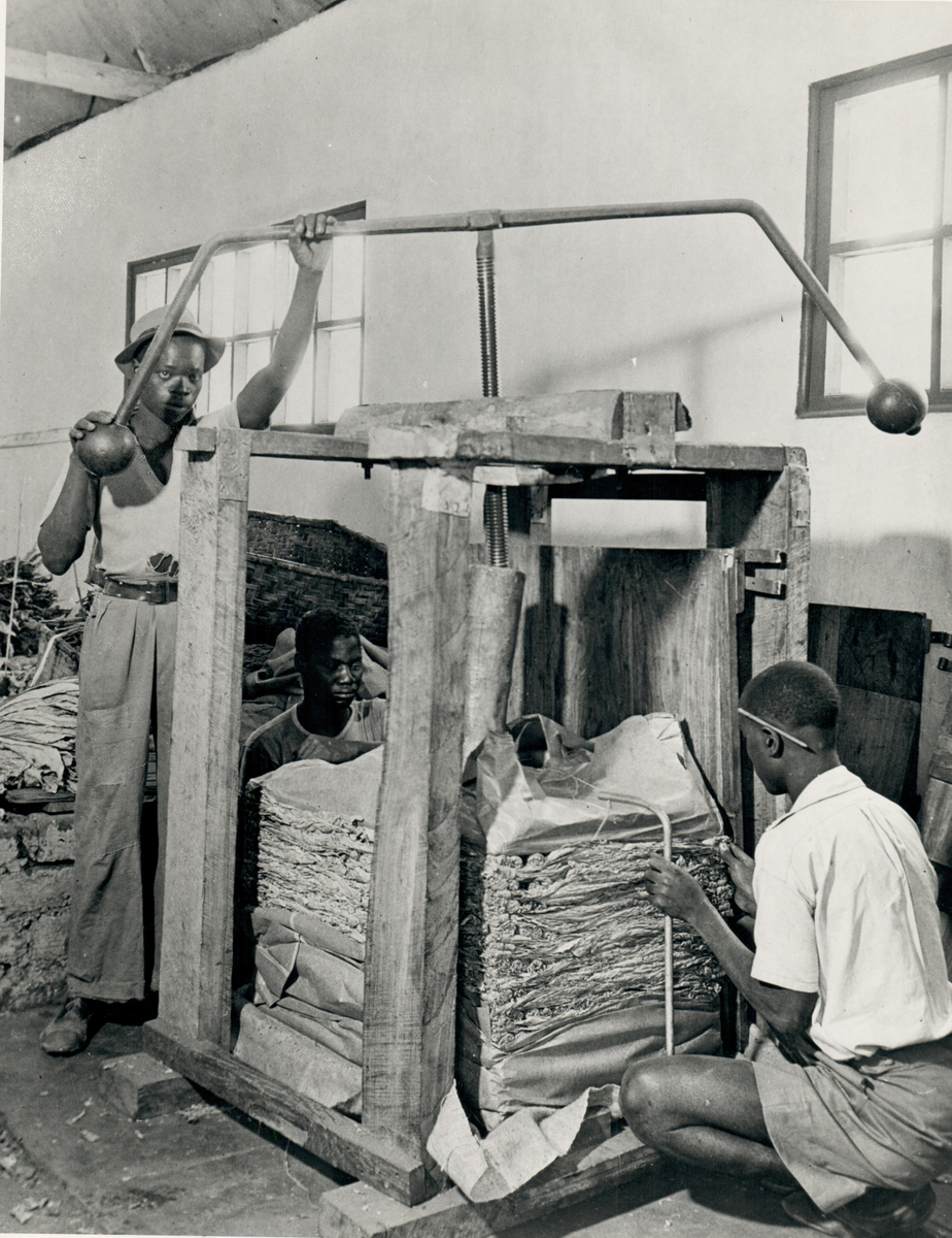 Torkad tobak pressas ihop för att sedan transporteras till auktionen vid Fort Jameson.