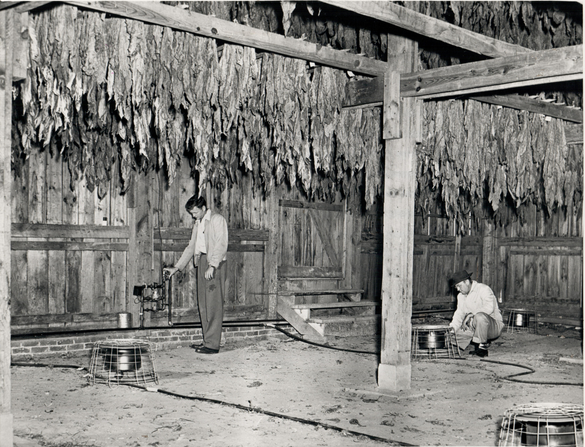 Två tobaksodlare i North Carolina justerar värmesystemet som torkar tobaken inuti torkladorna.