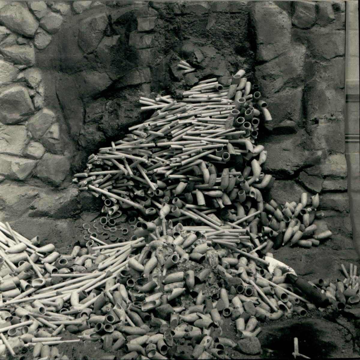 En del av världens största kritpipsfynd som upptäcktes i samband med en arkeologisk utgrävning vid Slussen 1984. Cirka 300 000 kritpipor hittades vid platsen.