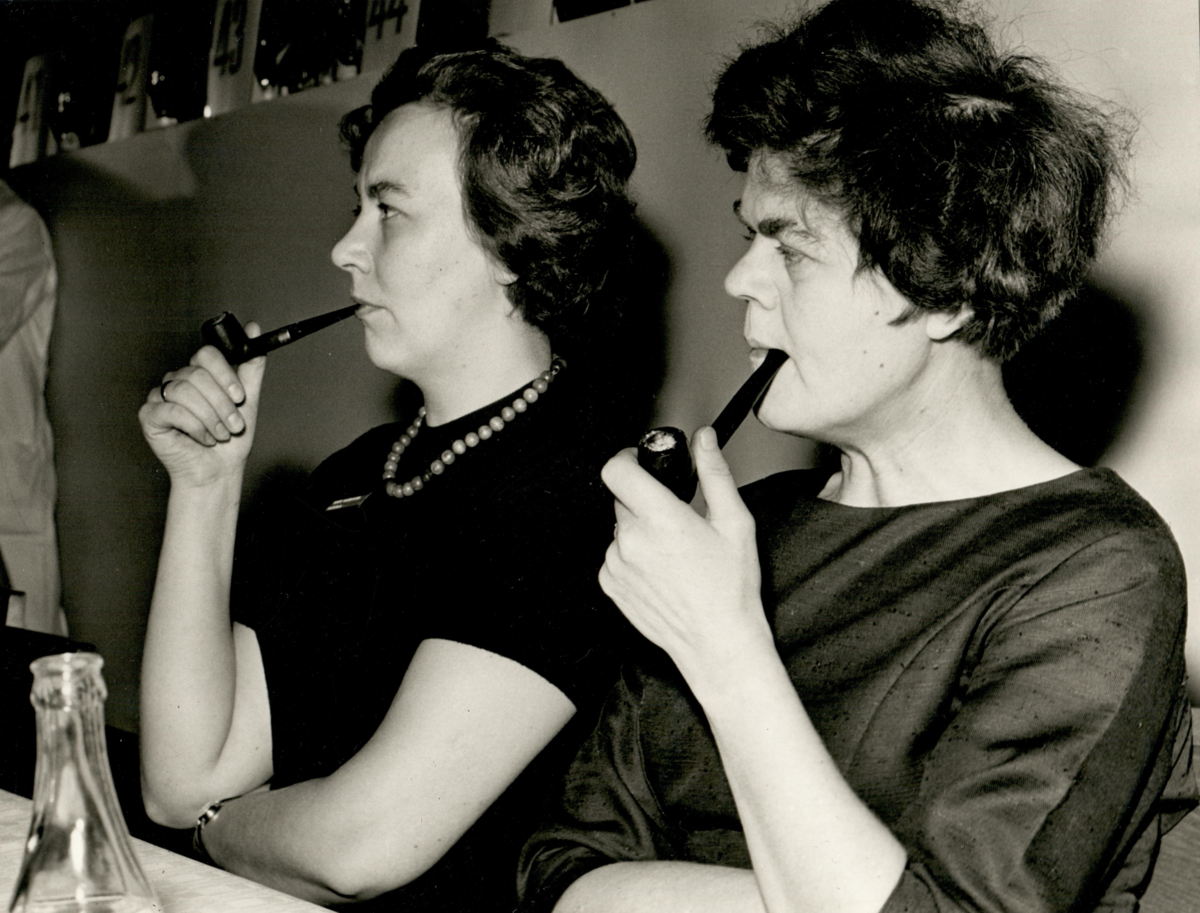 Två kvinnor röker pipa under SM i piprökning i Blå Hallen 1965.