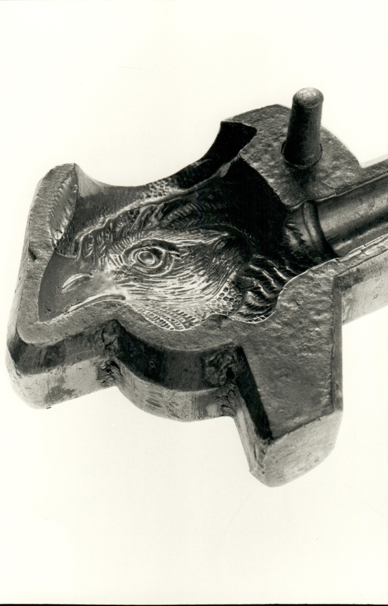 Del av kritpipsform med motivet av en örn. Bilden användes i Arne Åkerhagens bok "Pipmakare i Värmlandsskogarna: de sista kritpipsmakarna i Sverige".