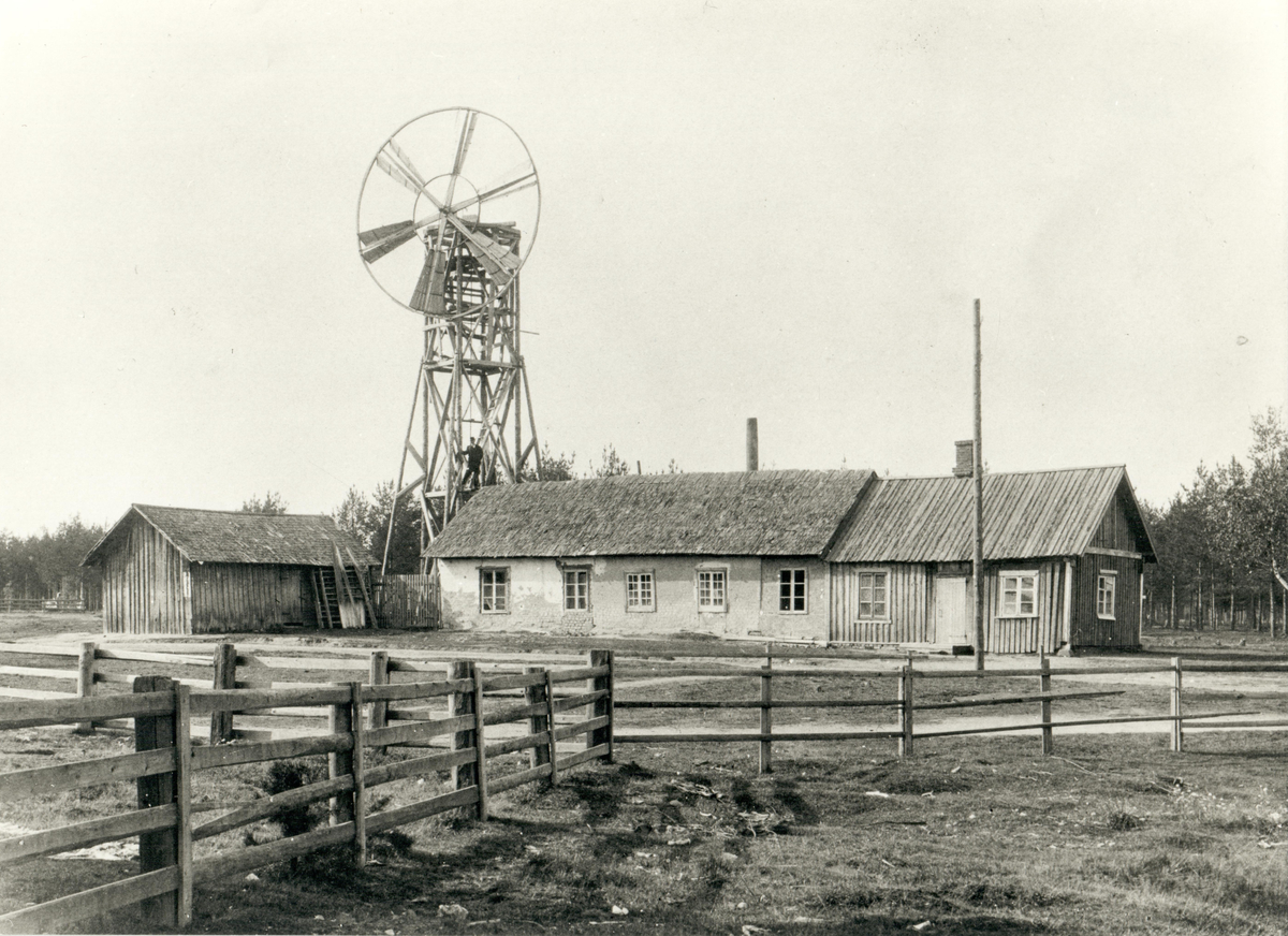 Stuga och väderkvarn i Värmland. Bilden användes i Arne Åkerhagens bok "Pipmakare i Värmlandsskogarna: de sista kritpipsmakarna i Sverige".