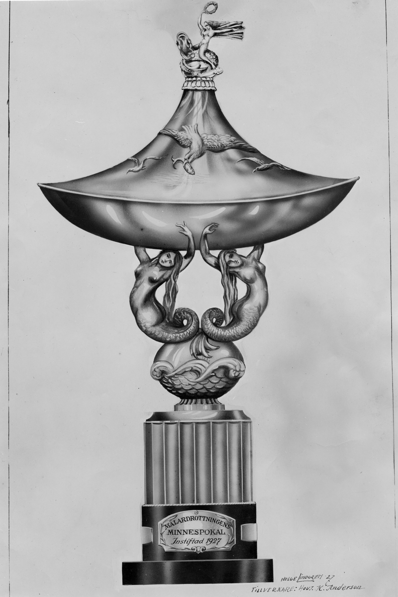 Helge Lindgrens ritning till den av Erik Åkerlund skänkta Mälardrottningens Minnespokal återgavs bland försättsplanscherna i KSSS årsbok 1927.