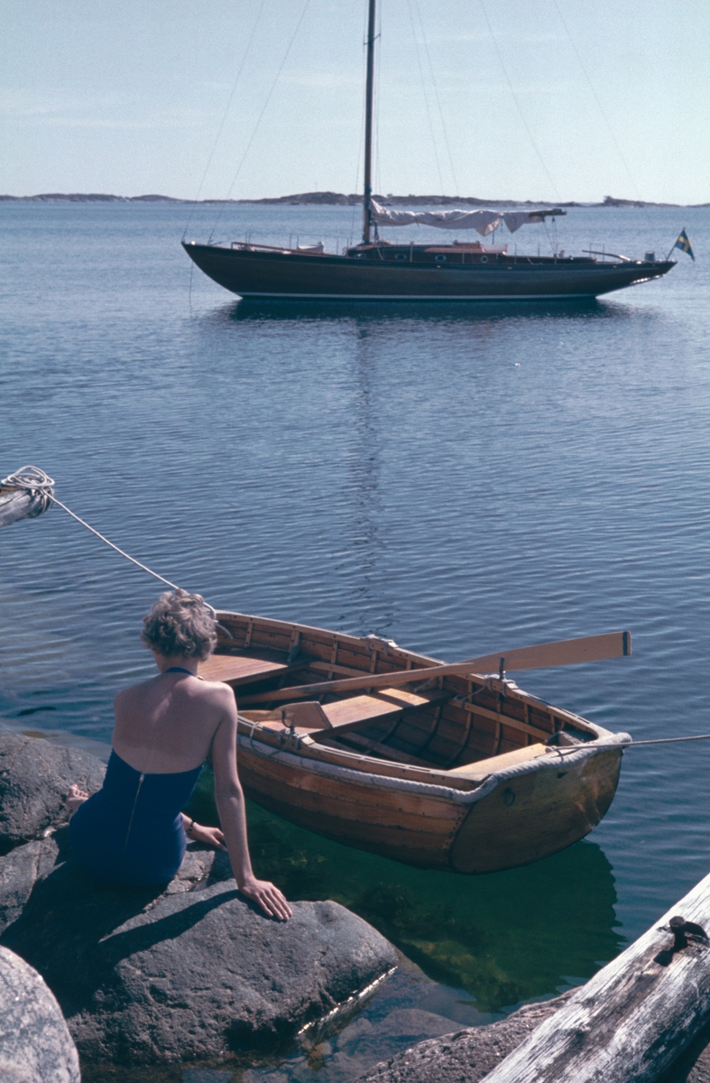 Kvinna med baddräkt på klipphäll i skärgården, segelbåten Elsi-Anne och en mindre roddbåt ligger förtöjda i närheten.