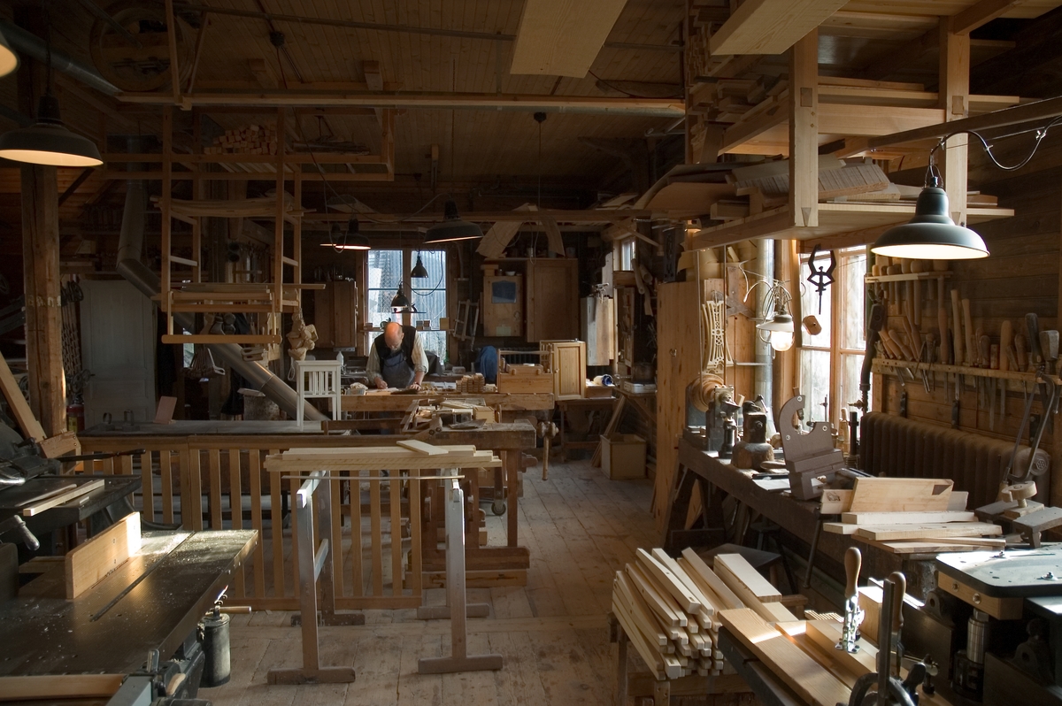 Interiör från Skansens snickerifabrik. Möbelsnickaren arbetar vid sin snickarbänk.