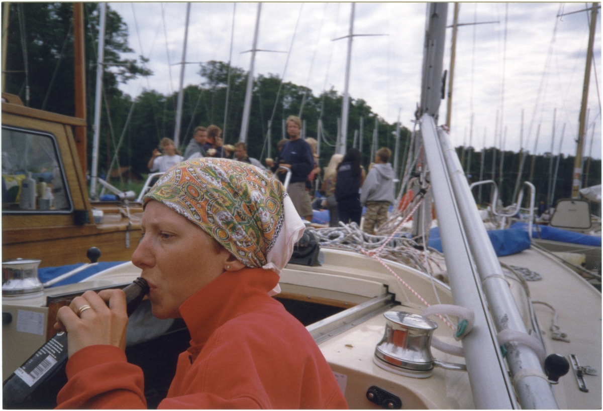 IF-båtliv. Kvinna dricker. Enl. givaren: "Törsten måste släckas 1999."