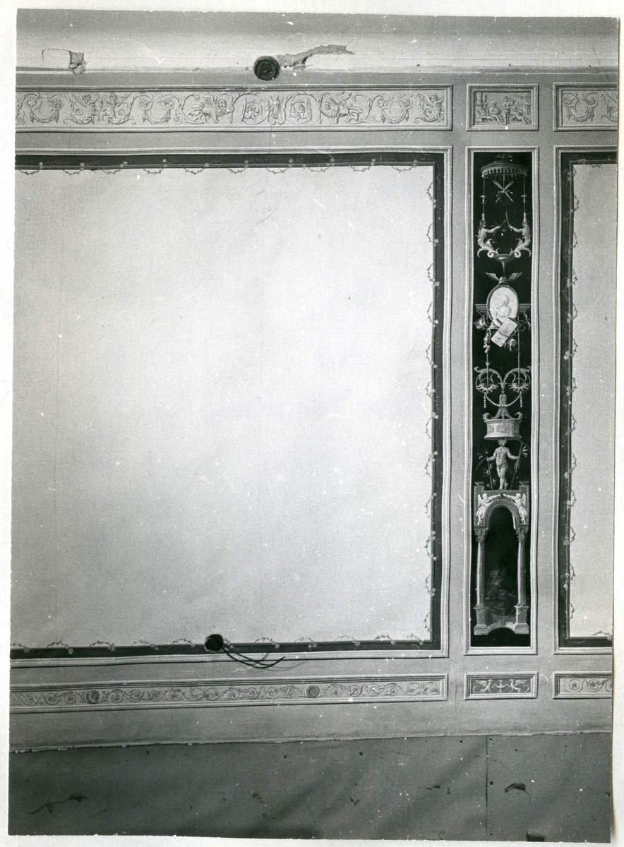 Titel: Arboga sn, Älholmen, (Ellholmen). Herrgården. Interiör. Väggfält med bemålade, ditspikade vävtapeter, före konservering. 1973.