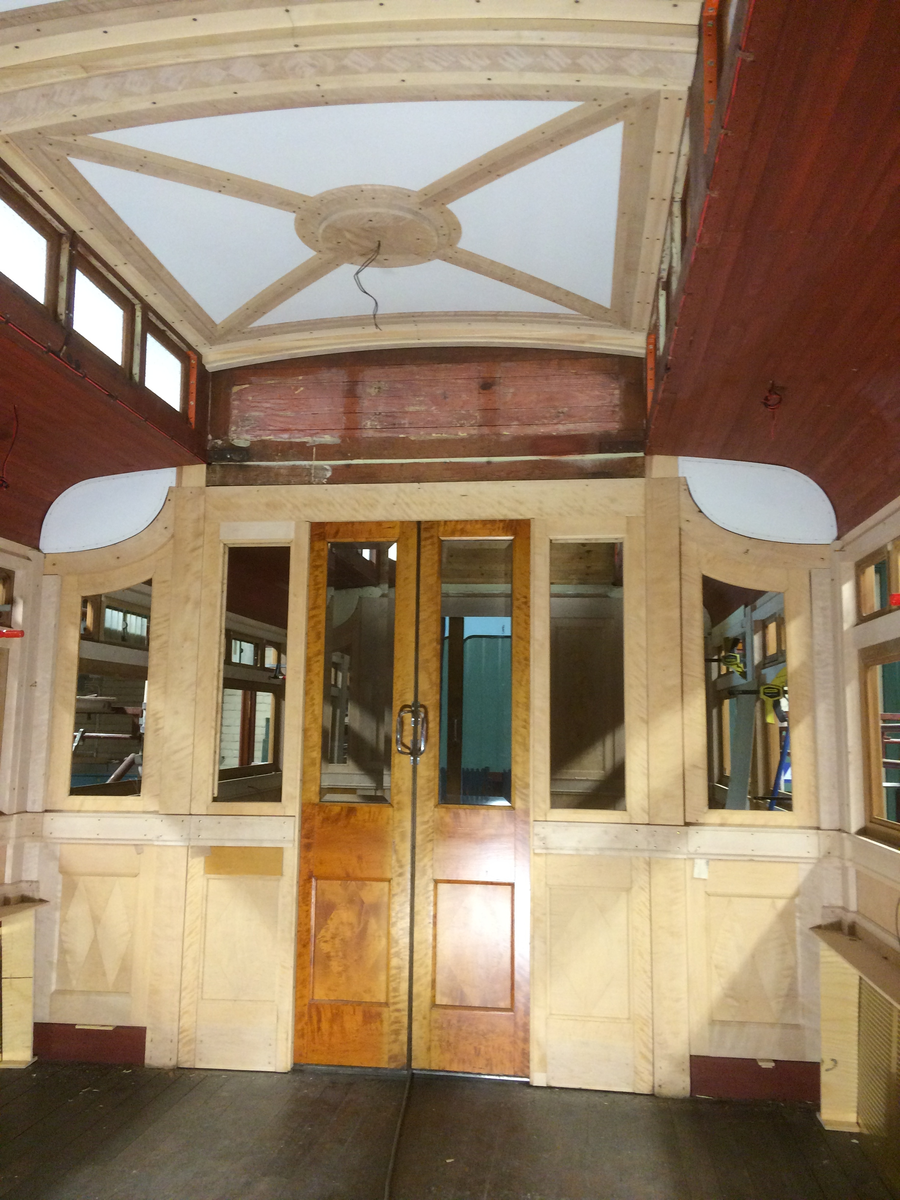 Vägg och skjutdörrar mellan matsal och kafédel i SJ Ro2 2702.