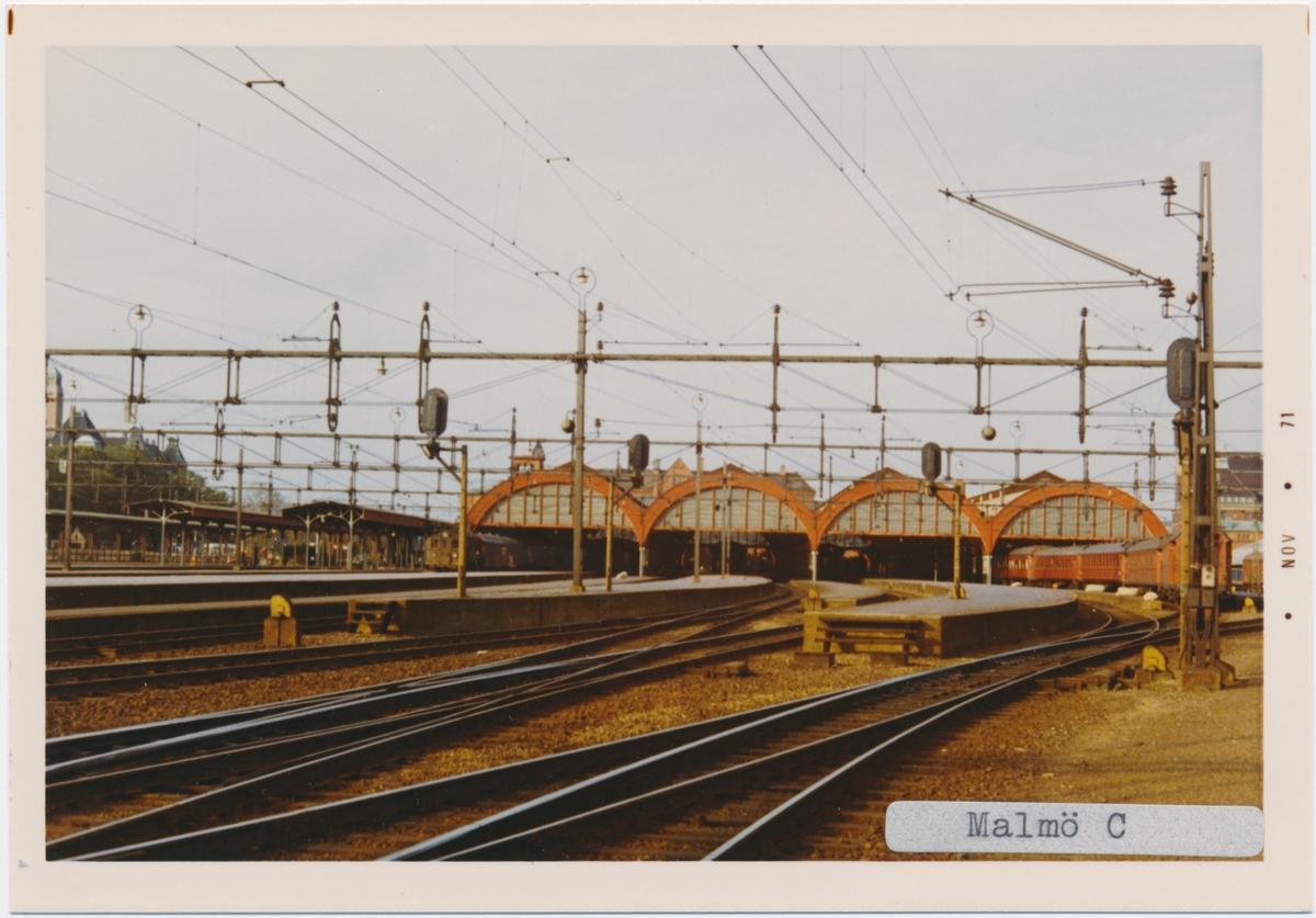 Malmö station 1971. Statens Järnvägar, SJ. Det första stationshuset invigdes 1856, men förstördes delvis i en brand 1866. Vid återuppbyggnaden kunde bara klocktornet bevaras och det andra stationshuset invigdes 1872. Med tiden anslöts fler banor till Malmö och det stora nya stationen med 4 nya spår blev klar 1891.1924 byggdes den nuvarande stationshuset. Banan elektrifierades 1933.