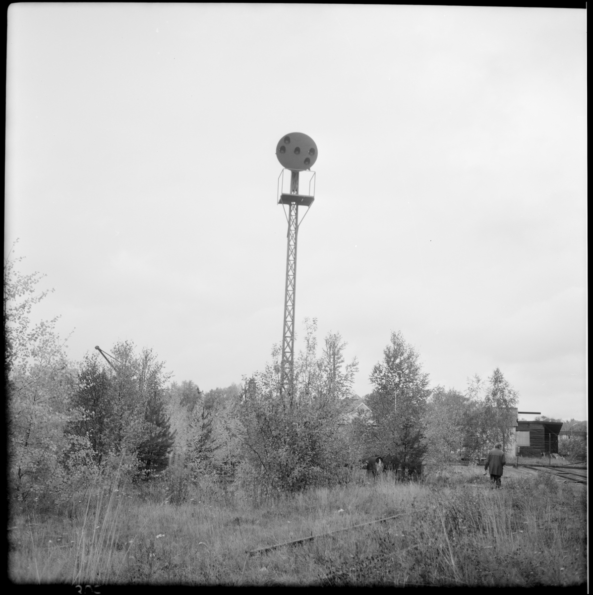 En stolpe som är en idé om en hög skylt i Läggesta Södra där det pågår arbete med läggning av smalspår av Museijärnvägen, Östra Södermanlands Järnväg, ÖSlJ.