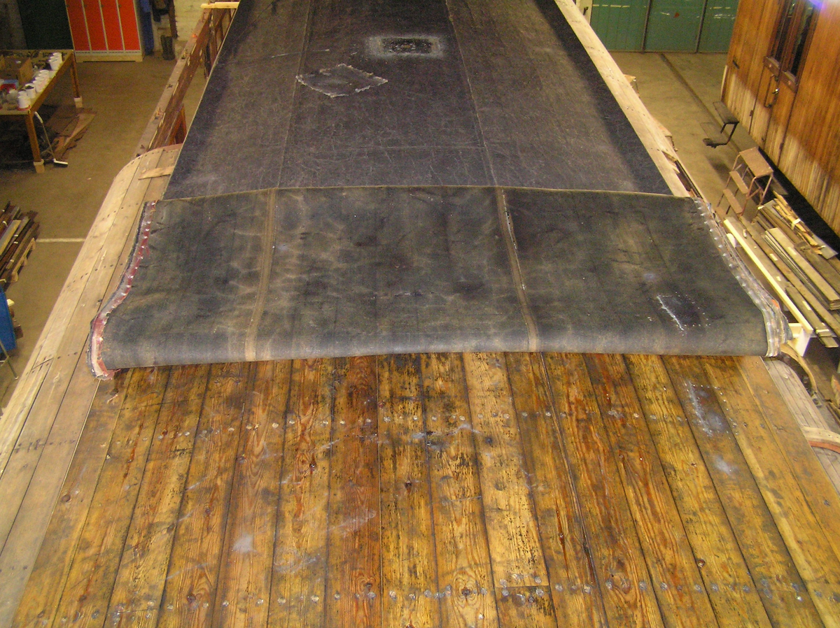 Översikt av taket på SJ Ro2 2702. Takväv delvis uppvikt. På mitten ett tidigare uttag för fläkt.