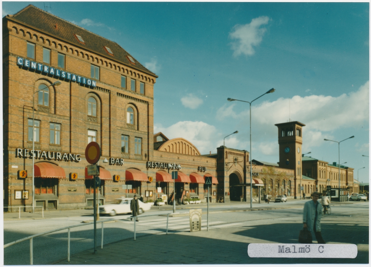 Malmö station 1971.Statens Järnvägar, SJ. Det första stationshuset invigdes 1856, men förstördes delvis i en brand 1866. Vid återuppbyggnaden kunde bara klocktornet bevaras och det andra stationshuset invigdes 1872. Med tiden anslöts fler banor till Malmö och det stora nya stationen med 4 nya spår blev klar 1891.1924 byggdes den nuvarande stationshuset. Banan elektrifierades 1933.