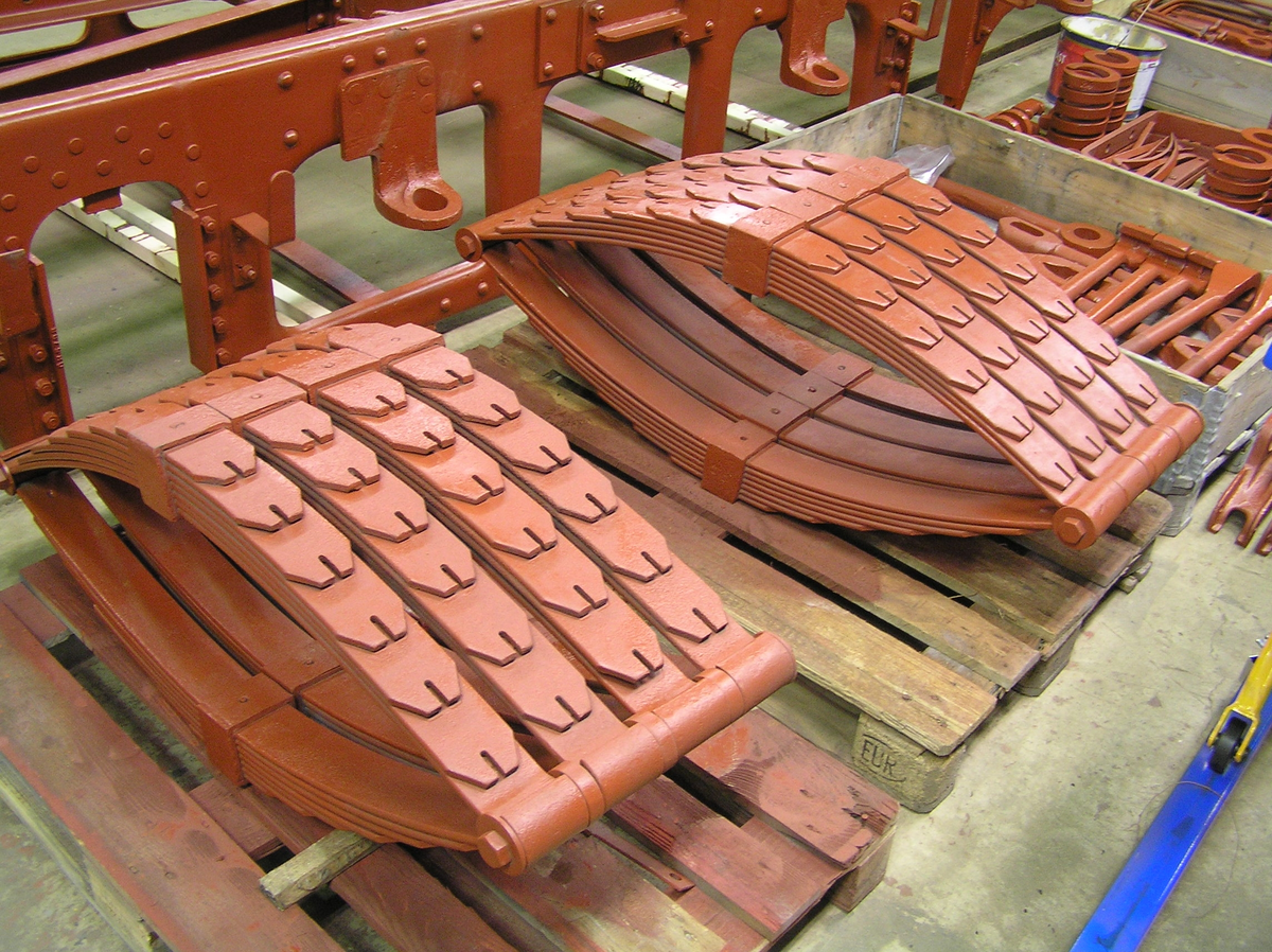 Ellipsfjädrar och andra delar från boggi rostskyddsbehandlade för SJ Ro2 2702.