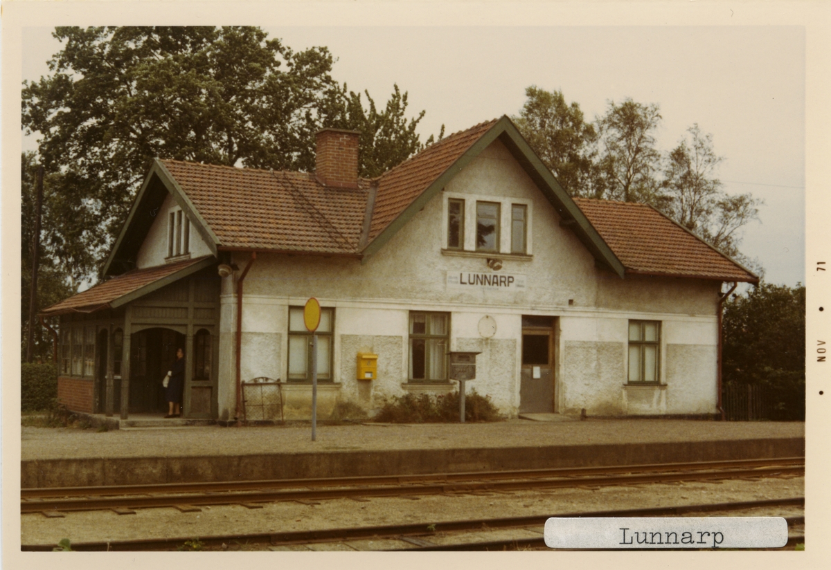 Lunnarp station 1971. Simrishamn - Tomelilla Järnväg, CTJ. Stationen öppnades 1882. Det första stationshuset byggdes 1882 och ett nytt byggdes 1915, som finns kvar som privatbostad. Gick över till Malmö-Tomelilla Järnväg, MöToJ 1896 och till Statens Järnvägar, SJ 1943. Banan elektrifierades 1996.