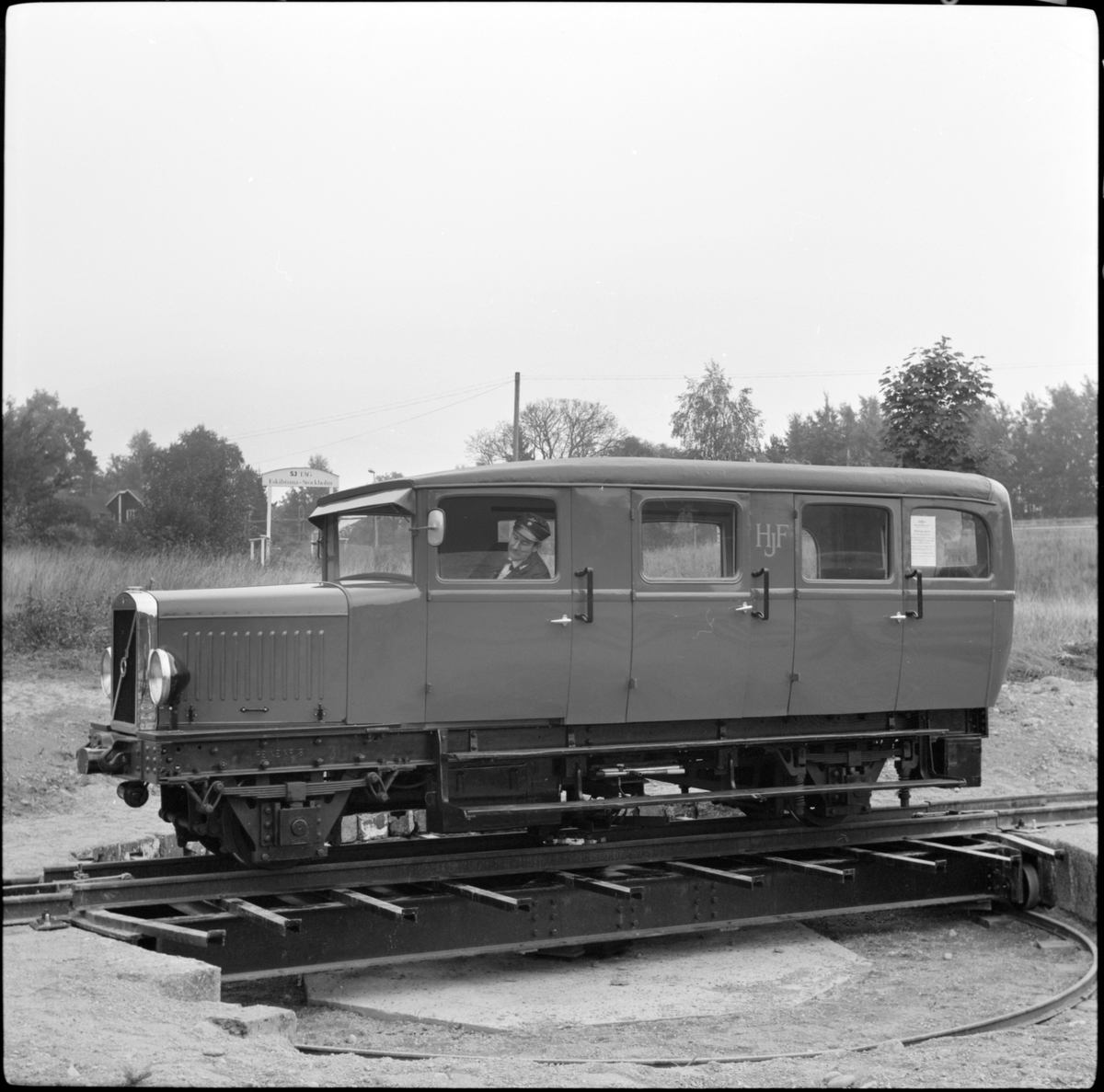 Hällefors - Fredriksbergs Järnväg, HFJ motorvagn tillverkad av Volvo på vändskivan vid Läggesta, Östra Södermanlands museijärnväg.