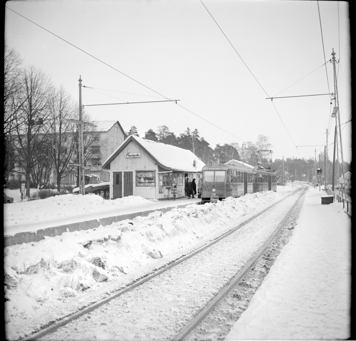 Trafik Aktiebolaget Stockholm Södra Lidingöns Järnväg, SSLidJ B24(A) 38 "ängbyvagn" linje 21 Ropsten - Gåshaga på Breviks hållplats.