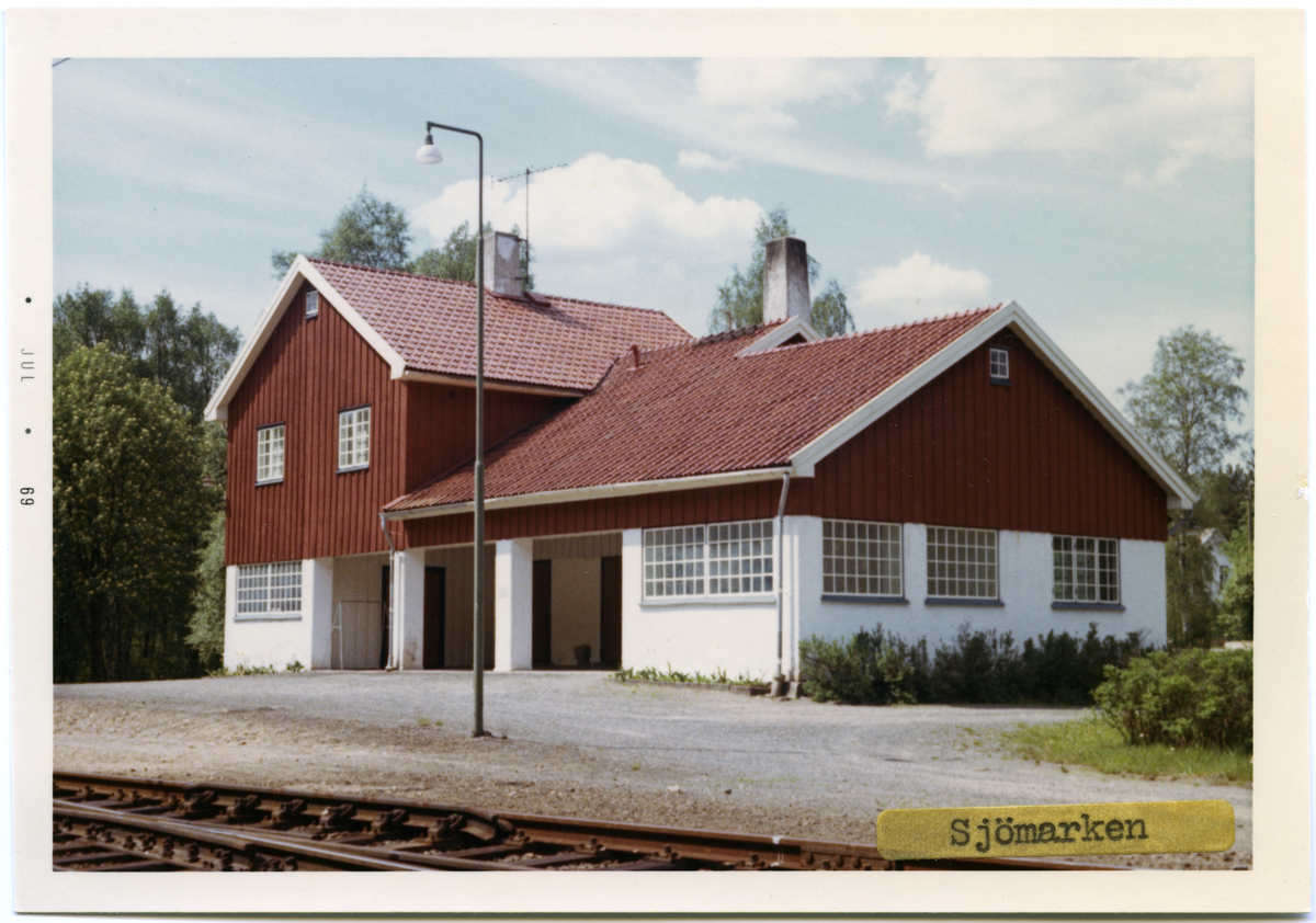 Vy vid Sjömarken. Stationen byggd 1913.Det anlades också en park- och badanläggning, driven av GBJ,Göteborg-Borås Järnväg fram till 1936, då den såldes till Borås stad. Persontrafiken nedlades fr o m 12 maj 1968 och godstrafiken fr o m 1 september 1974. Växeln till stickspåret borttogs i december 1975