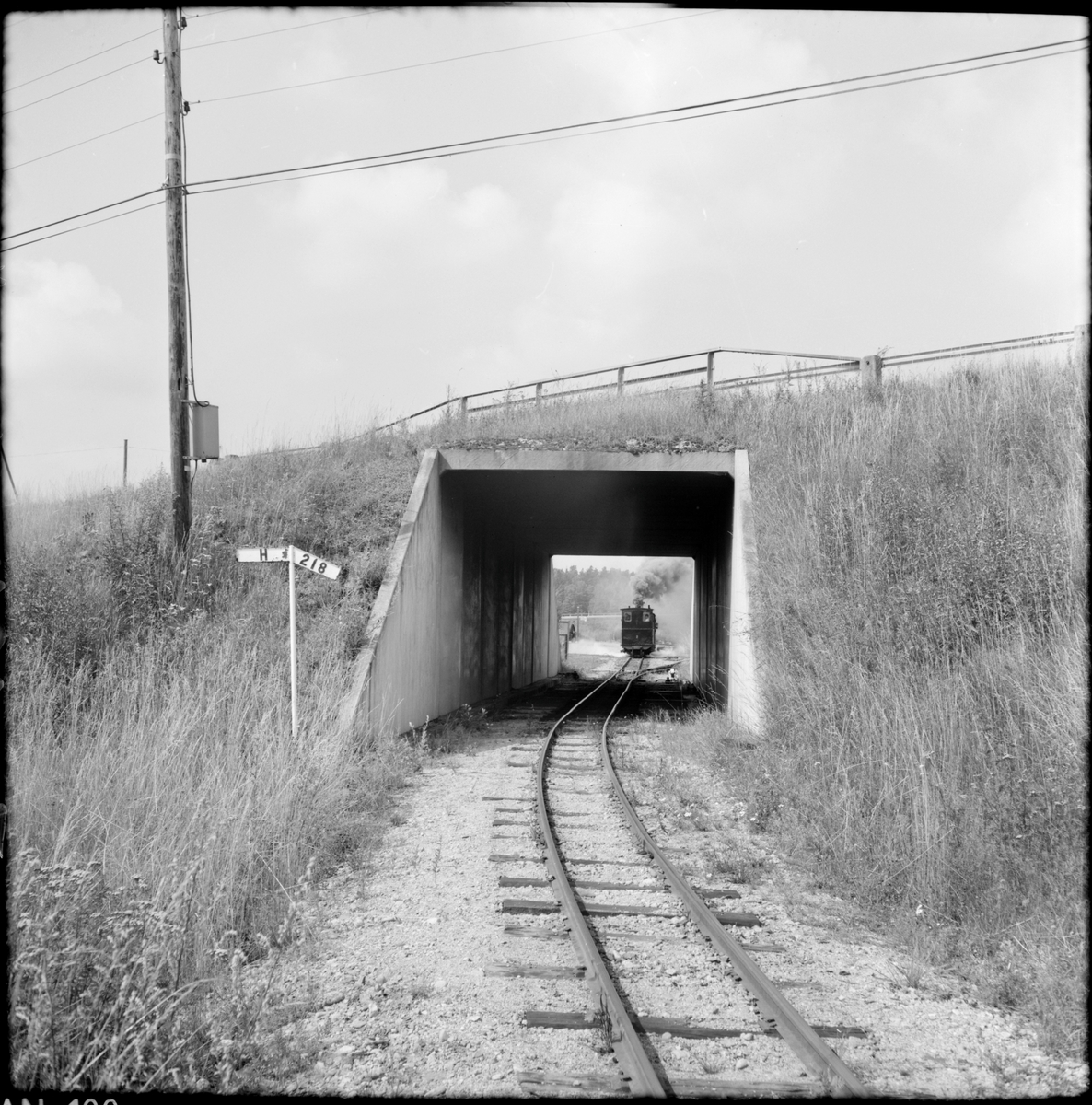 Museijärnvägen, Östra Södermanlands Järnväg, ÖSlJ Stafsjö Järnväg lok 2 "Dylta" skymtar bortanför viadukten vid Läggesta södra station.