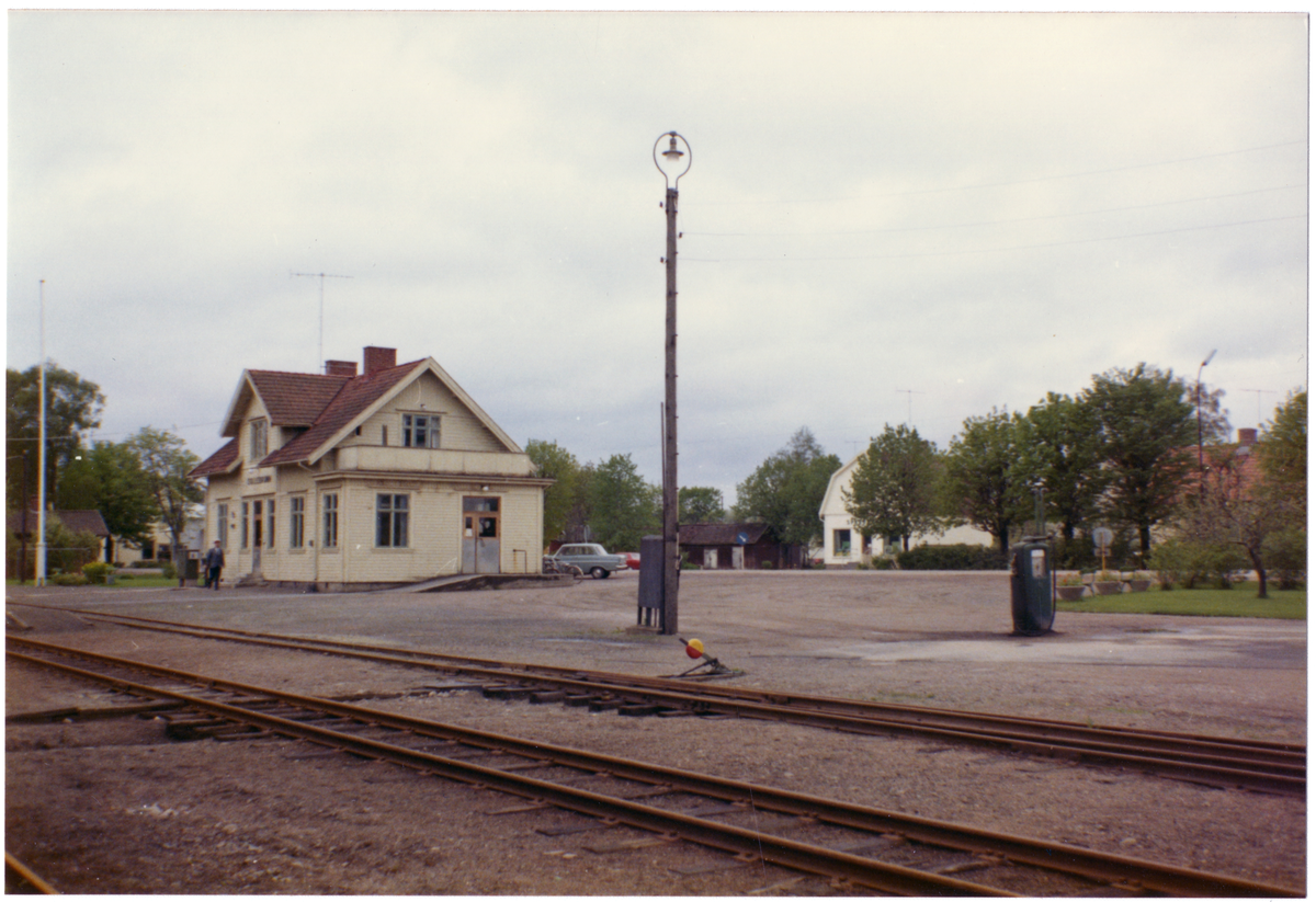 Västergötland - Göteborgs Järnväg, VGJ, Station anlagd 1899. Stationshus i en och en halv våning i trä. Expeditionslokalerna tillbyggdes 1939. Bil Opel kadett. Det står en bensinpump eller dieselpump vid stationen.