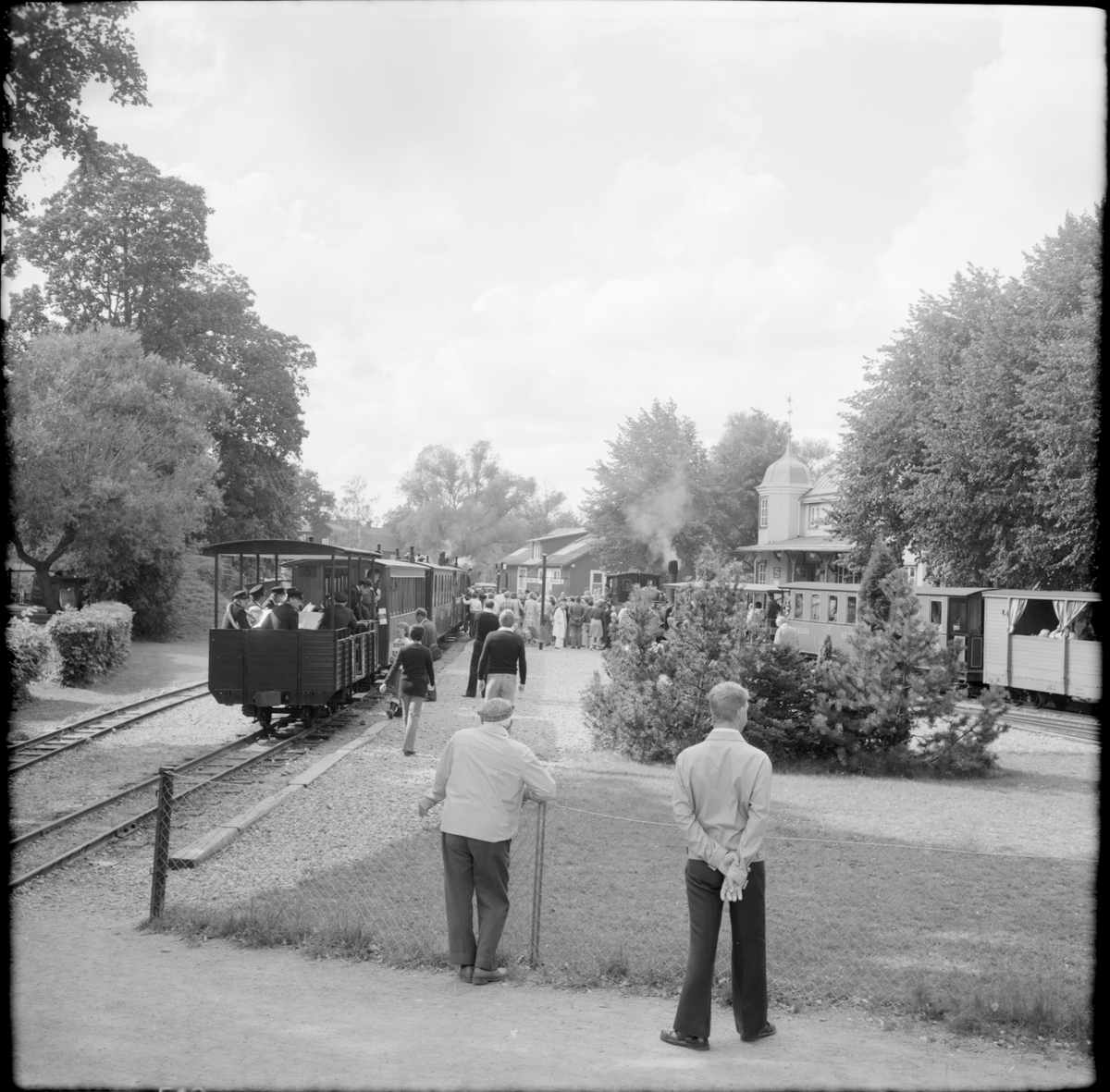Vy över järnvägsstationen i Mariefred. Till vänster i bild ses Museijärnväg Östra Södermanlands Järnväg, ÖSlJ musikkår Jernbanekapellet på ÖSlJ:s musikvagn, ursprungsbolag Nättraby - Alnaryd - Älmeboda Järnväg, NAÄJ KN 3 60.