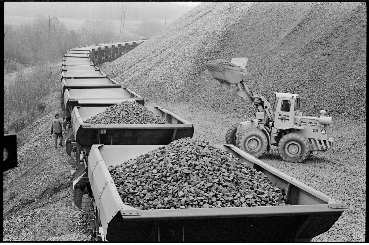 Titel: Bottentömningsvagnar, Statens Järnvägar, SJ Q 32. Lastning av makadam i Hjältakrossen.