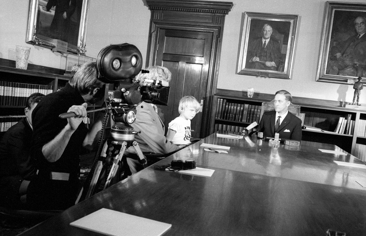 TV-inspelning av 1969 års adventskalender Herkules Jonssons storverk, med skådespelarna Tage Danielsson och James Dickson. Här i plenissalen med generaldirektör Lars Peterson.