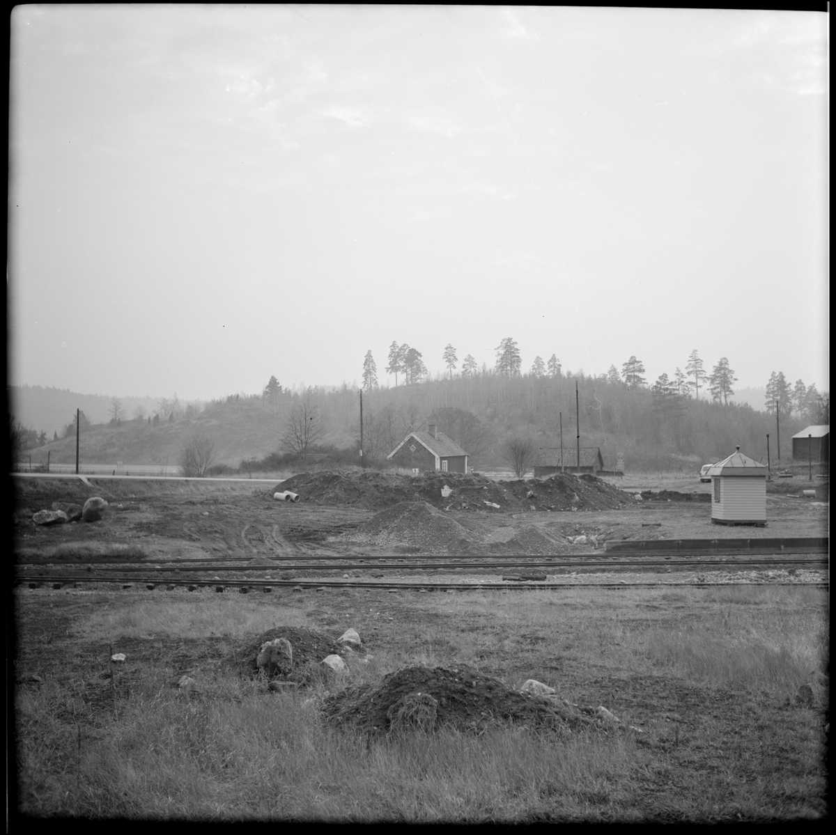 Pågående arbete med läggning av smalspår vid Läggesta Södra station där Museijärnvägen, Östra Södermanlands Järnväg, ÖSlJ förlänger bansträckningen. Stationshuset till höger i bild.