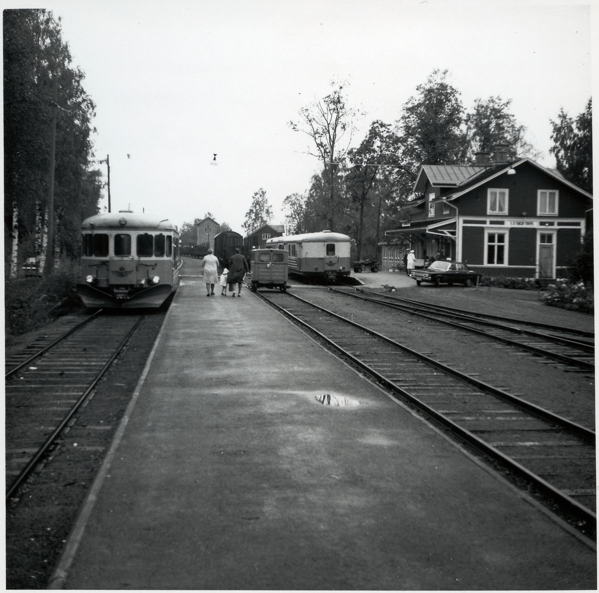 Lesjöfors med tåg 4965 från Vansbro till vänster och tåg 4960 mot Mora till höger.