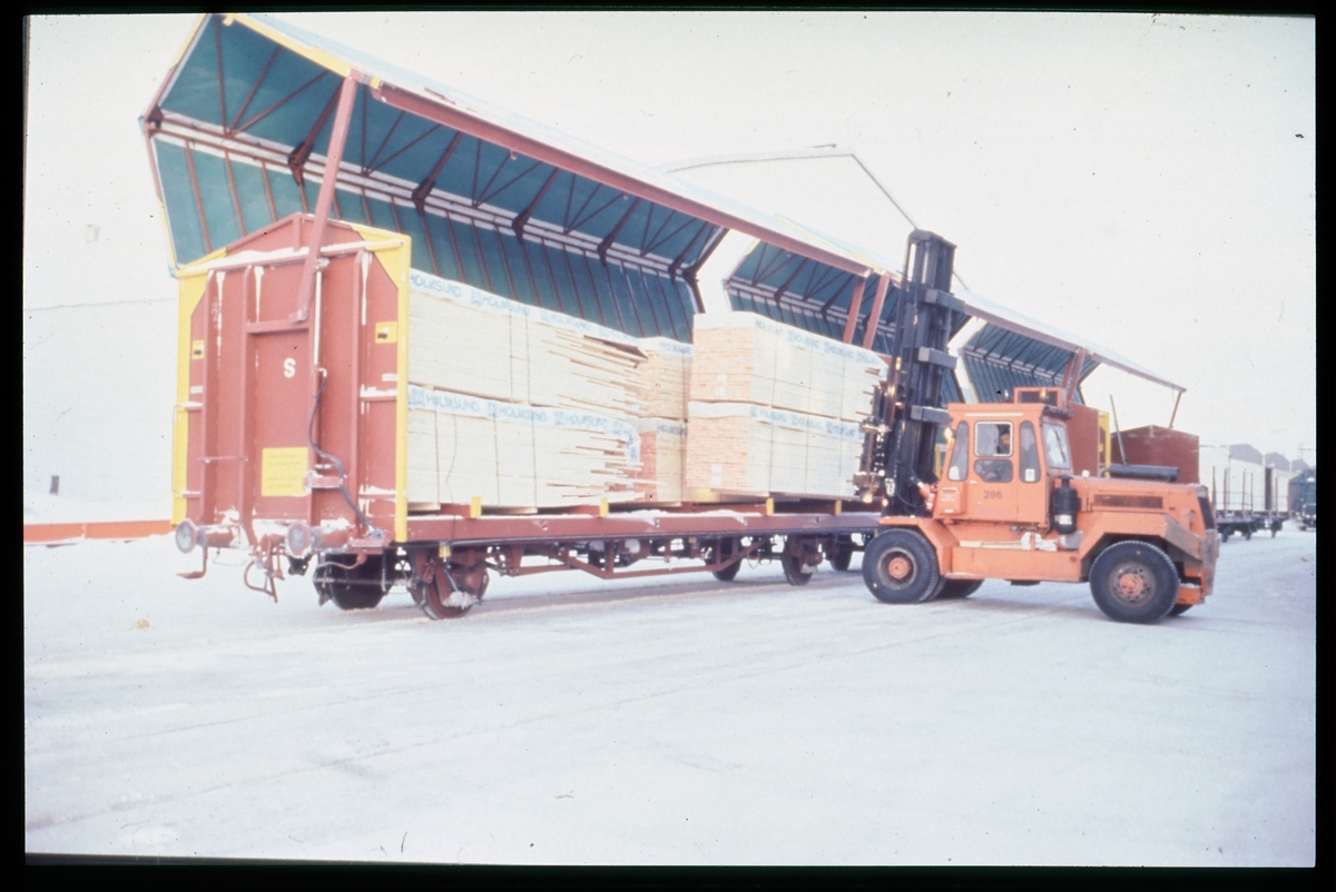 Statens Järnvägar, SJ Hbins-u. typ 853. Godsvagn med öppningsbar sida märkta SCA Shipping AB. Lastning/lossning av virkesbuntar med truck.