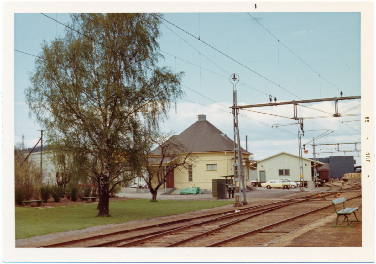 Vy vid Kinnahult. Namnet var tidigare KÄLLÄNG. Station anlagd 1918. Envånings stationshus byggt 1919 enligt Harald Söderberg, Varberg , putsat och med toppigt tak. Mekanisk växelförregling
