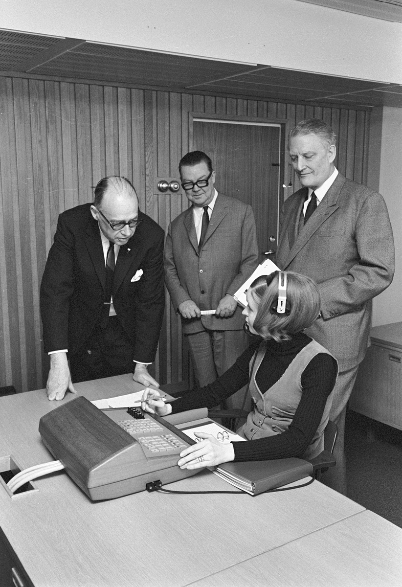 Statens Järnvägars automatiska fjärrtelefonnät. Pressvisning Ha växel. Generaldirektör Erik Upmark till höger på bilden