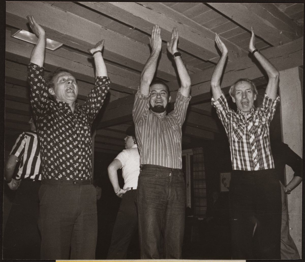 Trafikaktiebolaget Grängesberg - Oxelösunds Järnvägar, TGOJ anordnar motionsdans. På bilden ser vi från vänster Sten-Åke Svensson, Henry Pettersson och Gösta Adolfssson mitt uppe i en Tjeckisk Polka. Dansandet skedde i Skjulstastugan, strax söder om Eskilstuna.