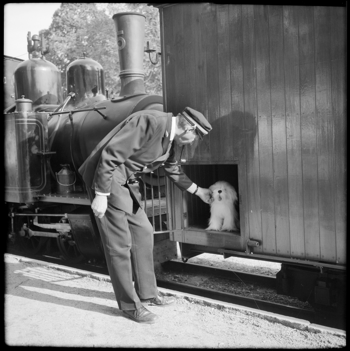 Museijärnvägen, Östra Södermanlands Järnväg, ÖSlJ personal klappar om uppstoppad hund i Helsingborg - Råå - Ramlösa Järnväg, HRRJ CFo 7 resegodsdel. Till vänster i bild ses lok 5 "Hamra".