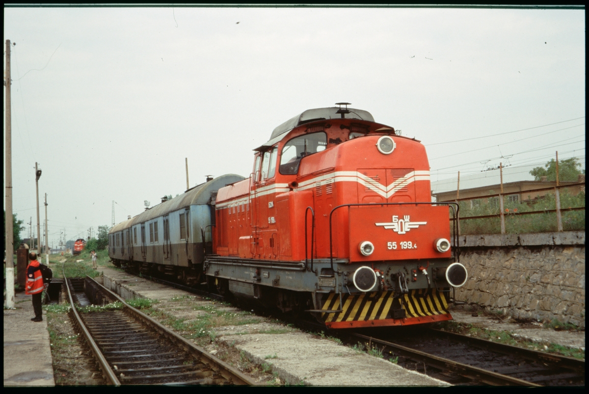 Persontåg dragen av diesellok vid Levski station i Bulgarien. Loket har nummer 55 199.4.