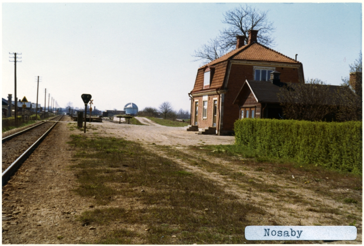 Station på SCJ öppnad 1874, senare håll- och lastplats. Ett äldre stationshus byggt av SCJ ersattes 1916 av ett byggt av BKB. Till SJ 1942. Breddad 1954. Eldrift 2007. Det runda vita är Gratia Dei (latin för "Guds nåd") är en stiftelse med sin ursprungliga hemvist inom Svenska kyrkan. Stiftelsen grundades 1950 av den högkyrklige församlingsprästen Gunnar Rosendal i Osby och äger och förvaltar idag kyrkobyggnaden Himmelska glädjens kapell, med tillhörande studenthem, i Kristianstad. (text Wikipedia.)