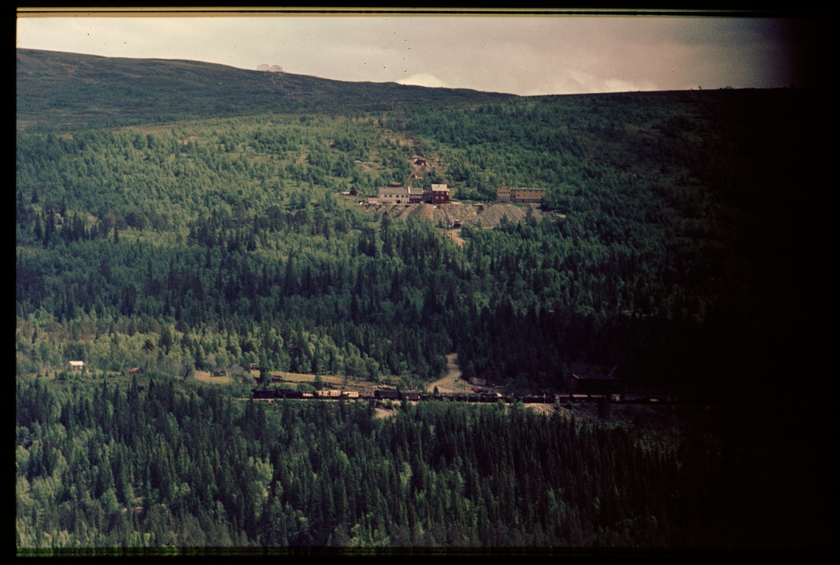Norges Statsbaner, NSB 63a, "Stortysk" med godståg på Rørosbanen. Upptill i bilden syns Killingdal svavelkisgruva. Gruvan var i drift 1891 till 1986.