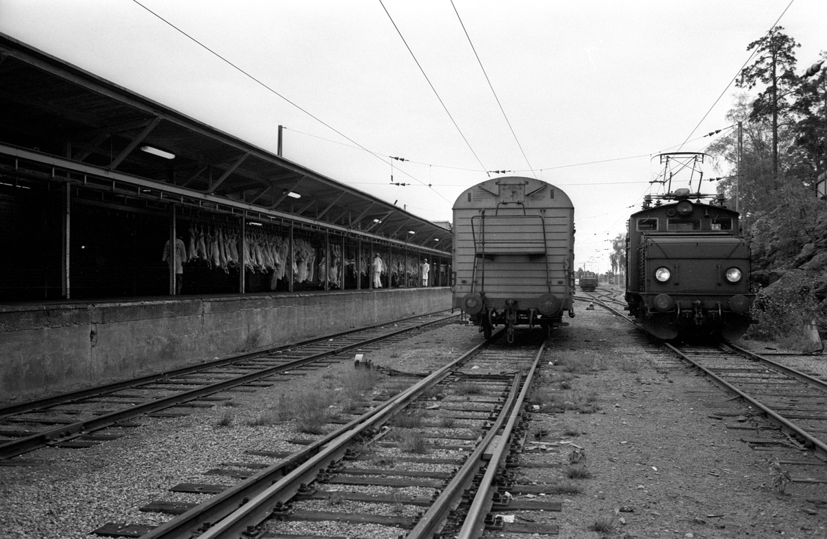 Statens Järnvägar SJ Hg 770. Slakthusbanan, lastningskaj för grovstyckade djurkroppar. Svinkroppar. Stockholm slakthusområde.