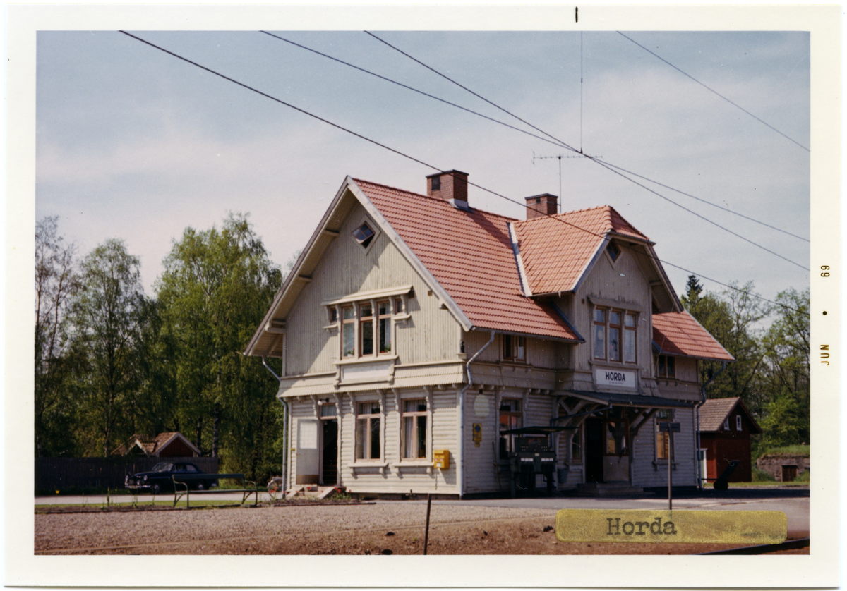 Vy vid Horda.Stationshus byggt 1902. enligt ritningar av arkitekt TJ Folcke, Göteborg, Tvåvånings stationshus i trä. renoverades 1947. Mekanisk växelförregling. Mekanisk växelförregling