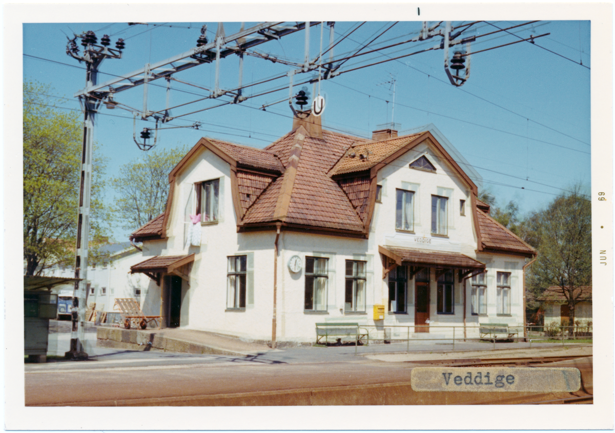 Vy vid Veddige. Station anlagd 1880. Tvåvånings stationshus, putsat byggt 1920 enligt arkiterk Harald Söderberg, Varberg. Elektrisk växelförregling.
