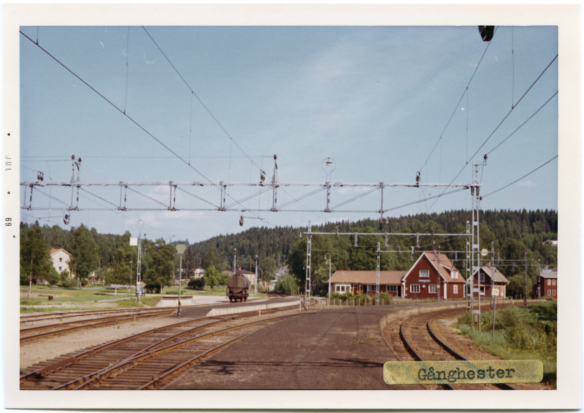 Vy vid Gånghester. Stationhuste byggdes 1917 enligt arkitekten Rudolf Lagne, Göteborg ritningar. Nya expeditionslokaler tillbyggdes 1948. Elektriskt ställverk